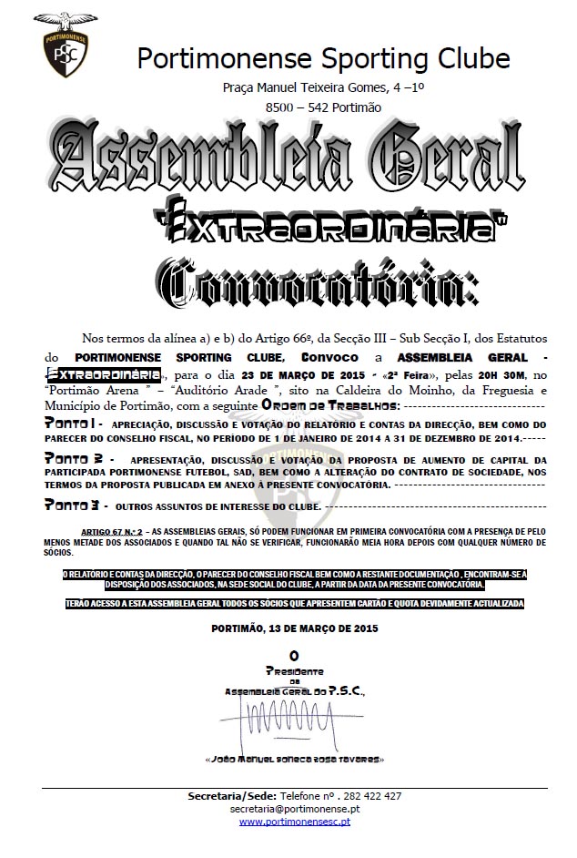 A Assembleia irá decorrer no Portimão Arena Auditório Arade, sito na Caldeira do Moinho, da Freguesia e Município de Portimão, com a seguinte ordem de trabalhos: