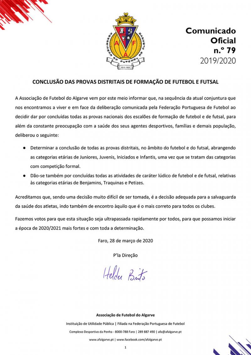 A Associação de Futebol do Algarve informa através de comunicado a conclusão de todas as provas distritais de competição e lúdicas, dos escalões de formação de futebol e de futsal relativas à época de 2019/2020 em face da atual conjuntura que afeta a saúde publica envolvendo o vírus identificado como Covid-19.