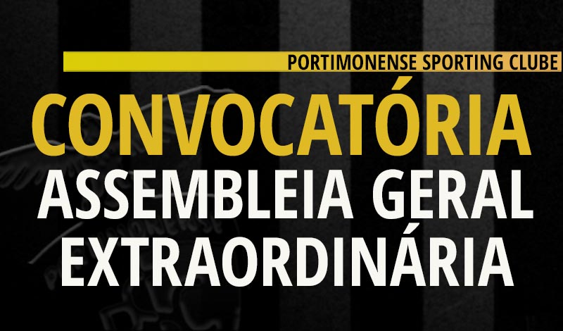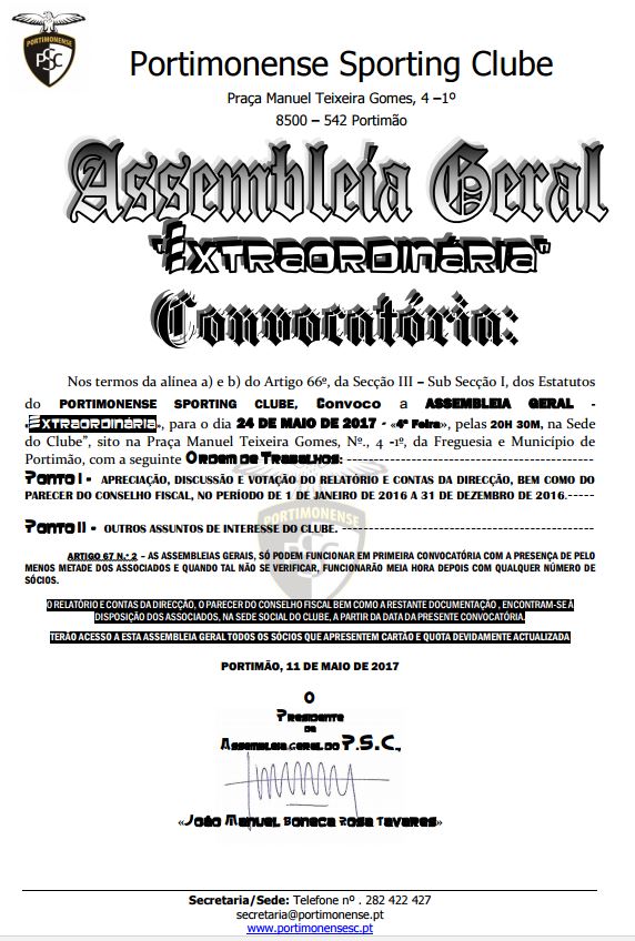 O Portimonense Sporting Clube vem por este meio convocar uma Assembleia Geral Extraordinária para o próximo dia 24 de maio de 2017 (quarta-feira) pelas 20:30 horas, na Sede do Clube.