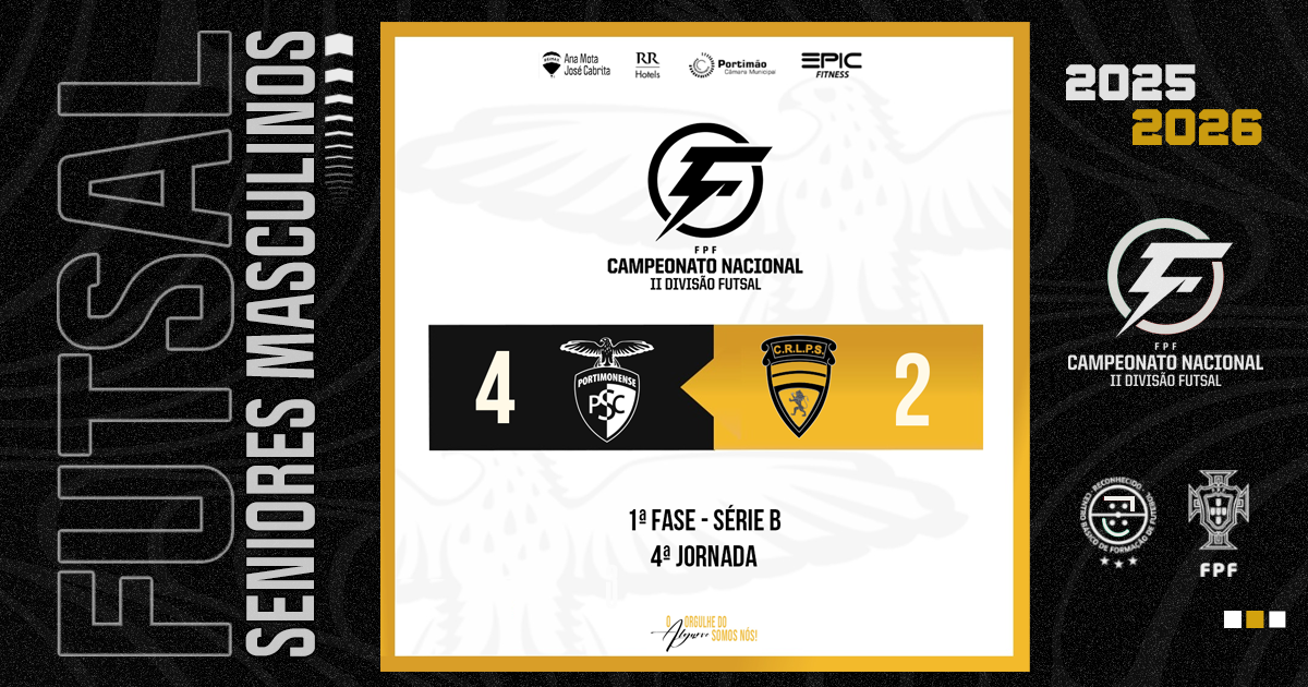 Os Seniores do Portimonense Futsal somaram este sábado a terceira vitória consecutiva em quatro jornadas, ao baterem o CR Leões de Porto Salvo B por 4-2, no Pavilhão Gimnodesportivo de Portimão, em partida a contar para a 4.ª jornada do Campeonato Nacional da II Divisão de Futsal, 1.ª Fase, Série B. Com este triunfo, a formação alvinegra mantém-se no topo da classificação, agora com 10 pontos.