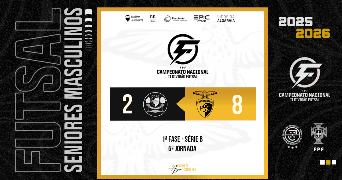 Os Seniores do Portimonense Futsal somaram este sábado a quarta vitória consecutiva no campeonato, ao vencerem o CCRD Burinhosa por 2-8, em encontro da 5.ª jornada da Série B da 1.ª Fase do Campeonato Nacional da II Divisão de Futsal. Com este resultado, a formação alvinegra mantém-se invicta na liderança da classificação, agora com 13 pontos.