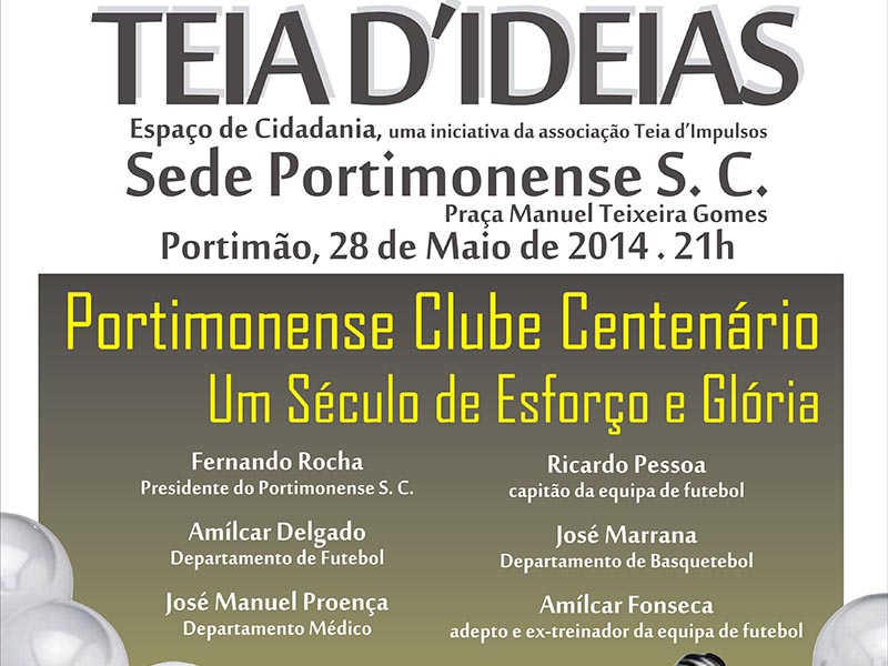 A Teia DImpulsos Associação Social, Cultural e Desportiva (TDI), em parceria com a Câmara Municipal de Portimão e a Rádio Costa DOiro, realiza, no próximo dia 28 de Maio, pelas 21.00 horas, o sexto episódio da terceira série do ciclo de debates Teia DIdeias. Subordinado ao tema Portimonense Clube Centenário Um Século de Esforço e Glória, o debate irá decorrer na Sede do Portimonense S. C. (Praça Manuel Teixeira Gomes, n.º 4, 1.º andar).